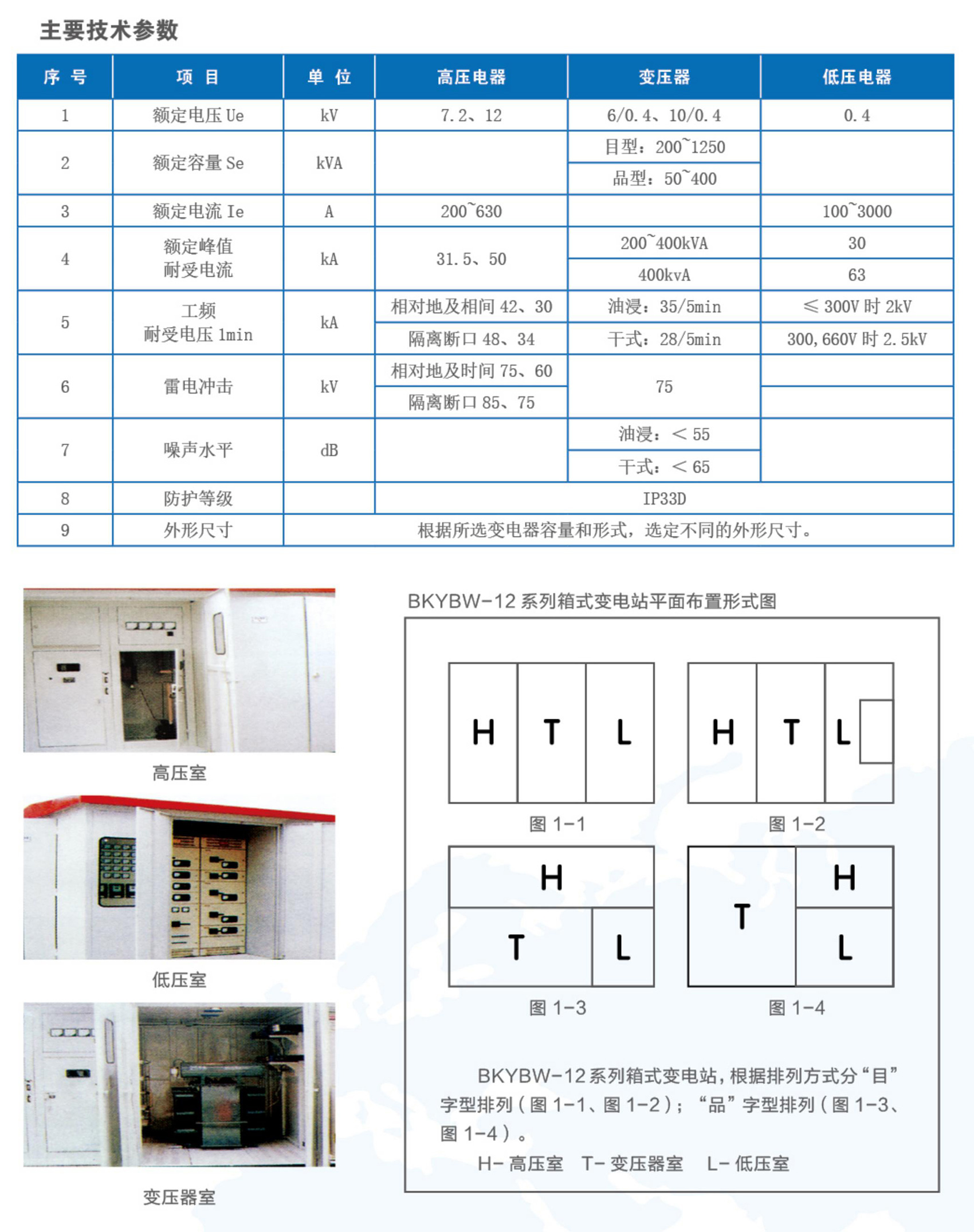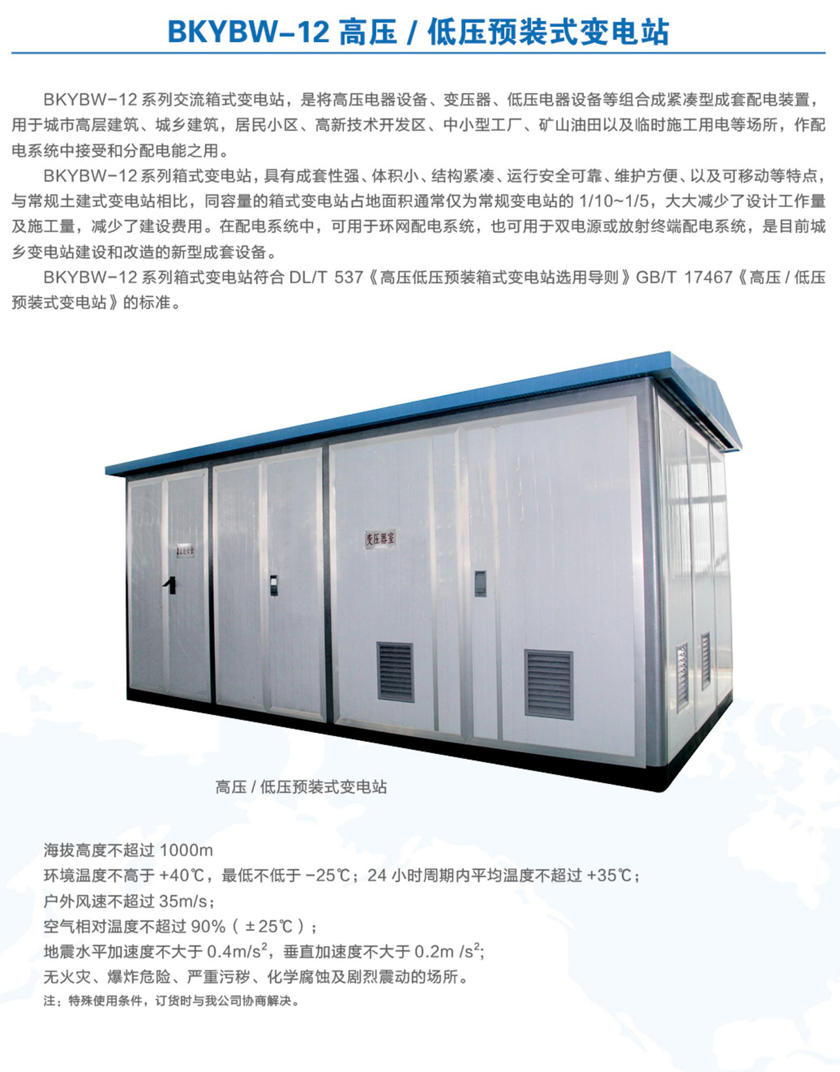 BKYBW-12系列交流箱式变电站,是将高压电器设备、变压器、低压电器设备等组合成紧凑型成套配电装置,用于城市高层建筑、城乡建筑,居民小区、高新技术开发区、中小型工厂、矿山油田以及临时施工用电等场所,作配电系统中接受和分配电能之用。BKYBW-12系列箱式变电站,具有成套性强、体积小、结构紧凑、运行安全可靠、维护方便、以及可移动等特点,与常规土建式变电站相比,同容量的箱式变电站占地面积通常仅为常规变电站的1/10~1/5,大大减少了设计工作量及施工量,减少了建设费用。在配电系统中,可用于环网配电系统,也可用于双电源或放射终端配电系统,是目前城乡变电站建设和改造的新型成套设备。