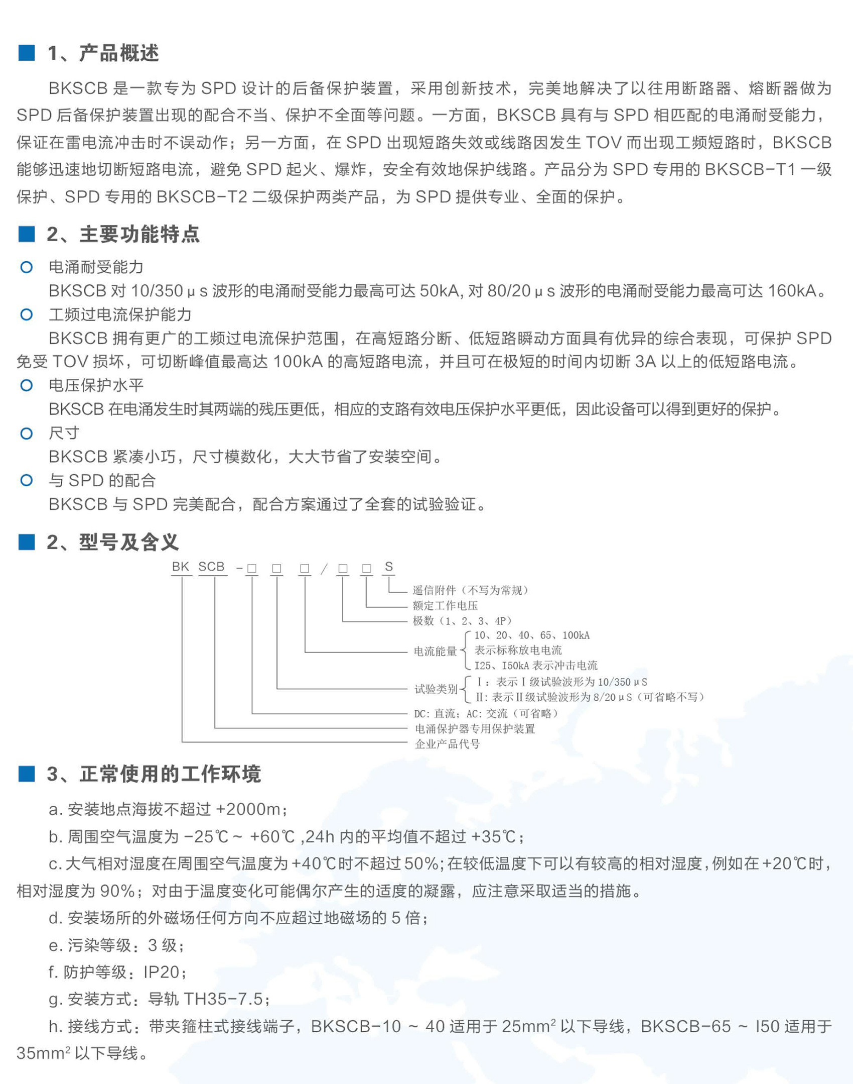 BKSCB系列电涌保护器专用保护装置适用于交流50Hz/60Hz、额定工作电压至400V,需安装SPD(防雷保护器)设备的电路中,为试验类别为Ⅰ类和II类的电涌保护器提供专业的后备保护。本产品符合NB/T 42150标准。