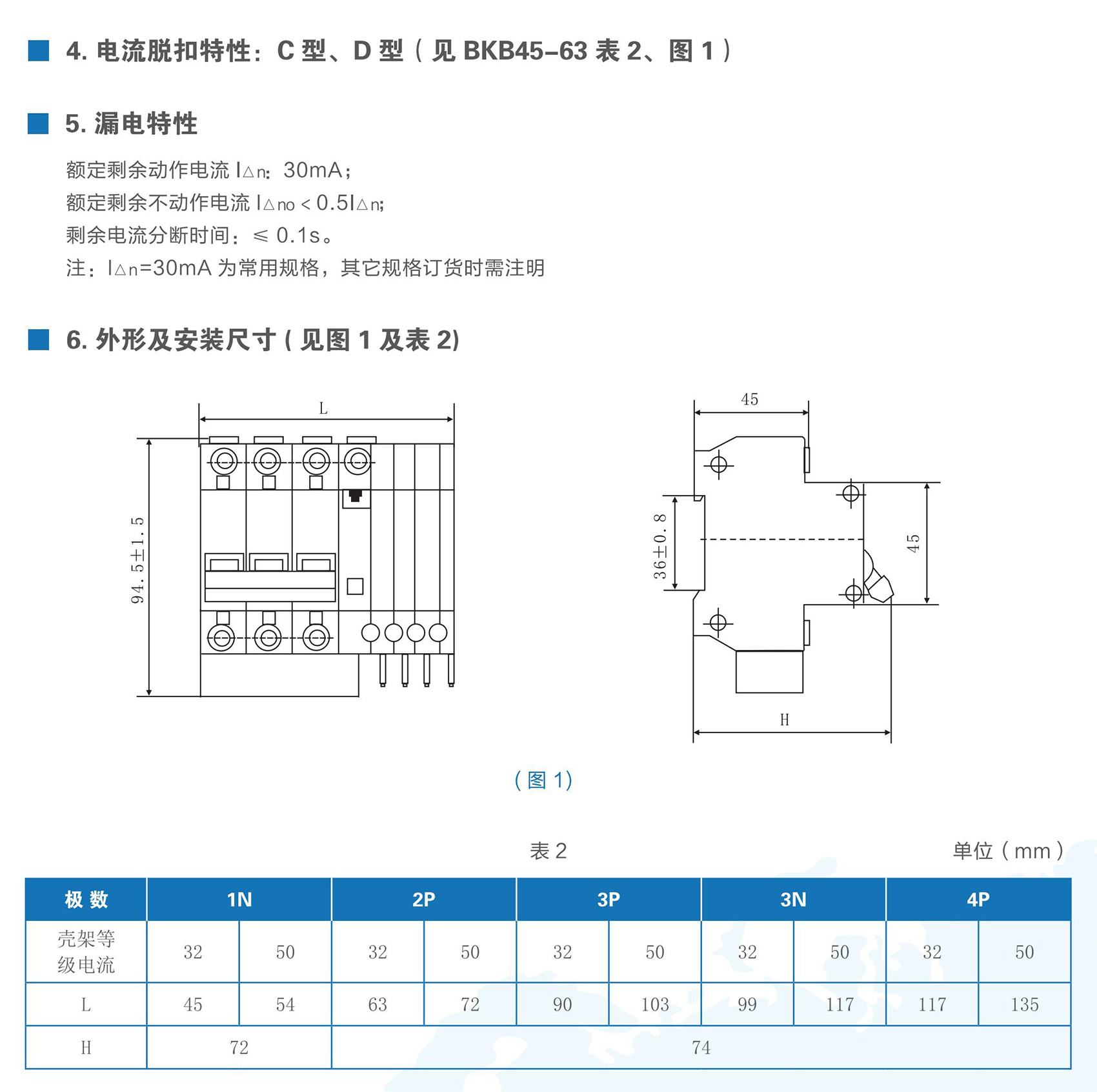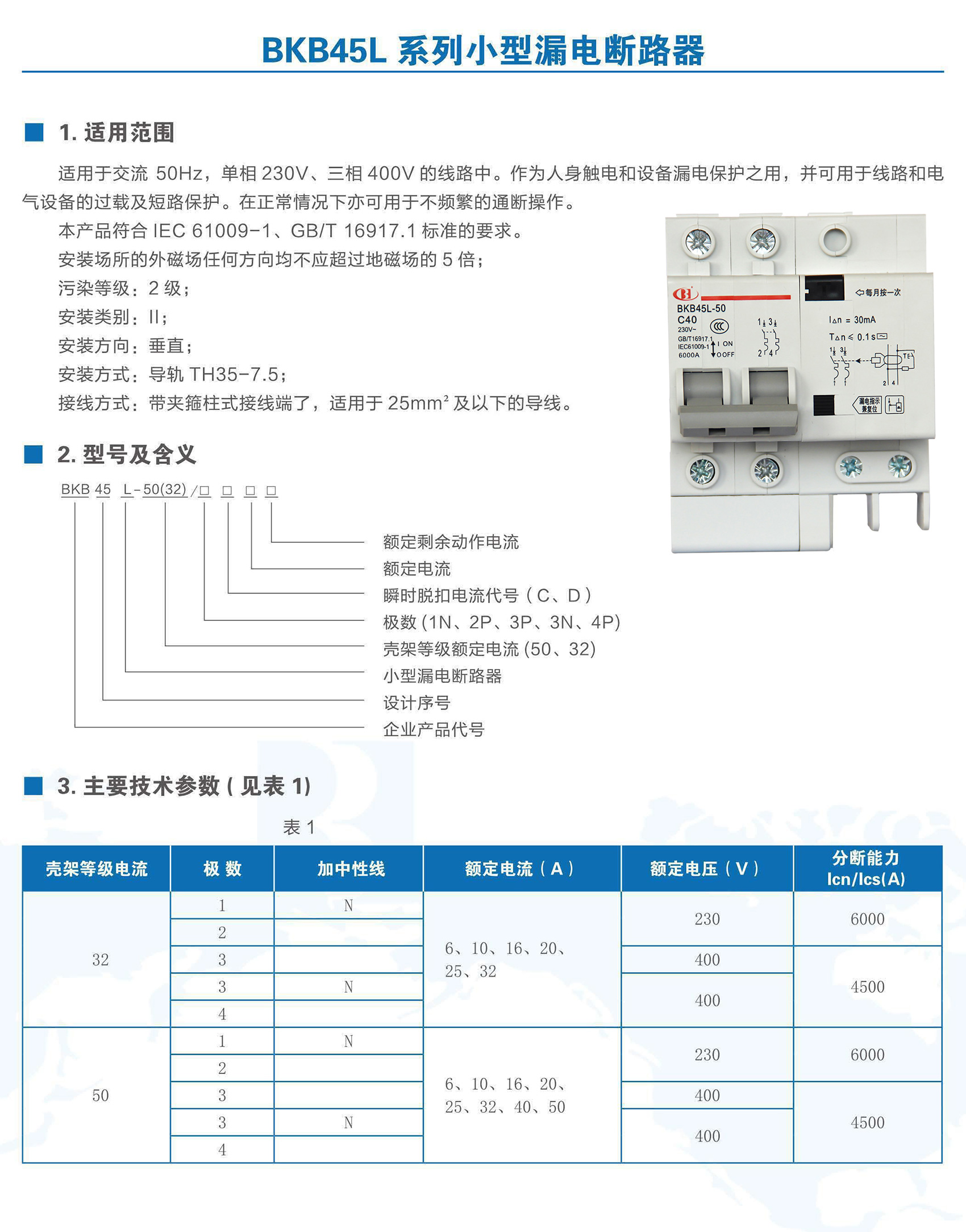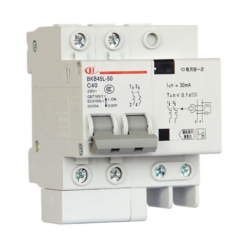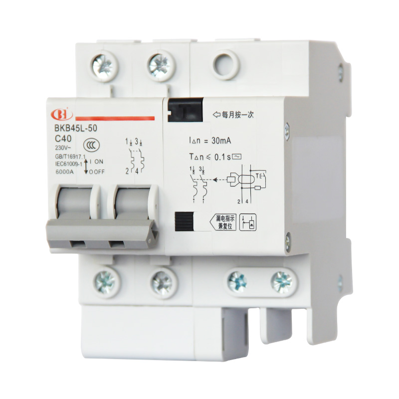 BKB45L-50系列带剩余电流保护小型断路器适用于交流50Hz、额定电压至400V,额定电流6~50A 的线路中。作为人身触电和设备漏电保护之用,并可用于线路和电气设备的过载以及短路保护。在正常情况下亦可用于不频繁的通断操作。本产品符合GB/T 16917.1、IEC 61009-1标准。