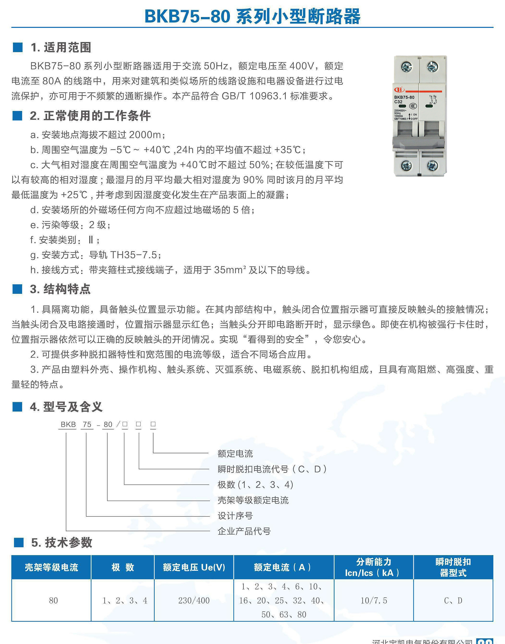 BKB75-80系列小型断路器适用于交流50Hz,额定电压至400V,额定电流1~80A,额定绝缘电压690V的系统线路中。用来对建筑电厂、变电站、电信、交通、冶金、工矿业等及类似场所的系统线路、电气设备进行过电流保护,也可以用于不频繁的通断操作。适用于非专业人员使用且不需要进行维护。本产品符合GB/T 10963.1、IEC 60898-1标准。